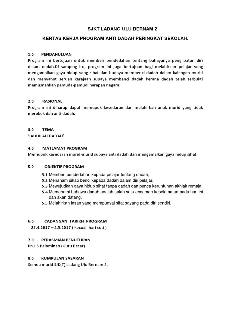 Program anti dadah sabahkertas kerja program ceramah dalam taliananti dadahaadk keningauppda sk luagan. TENTATIF PROGRAM PENUTUP KERTAS CADANGAN PROGRAM ANTI DADAH Program ini diharapkan dapat dilaksanakan dengan baik dan seterusnya memberi impak yang positif.